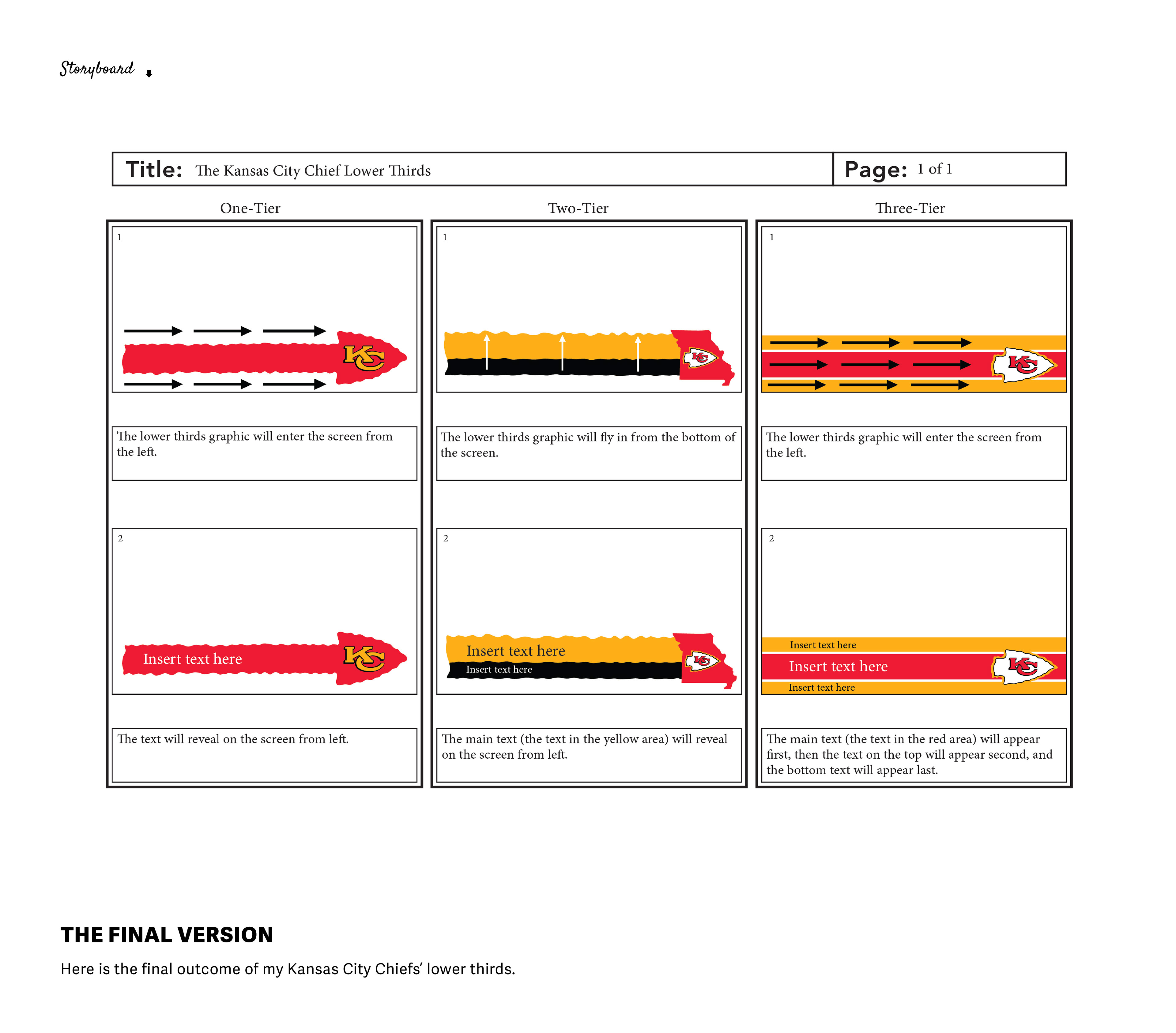 Develop one, two, and three-tiers of an animated lower thirds for a professional sports organization/team.